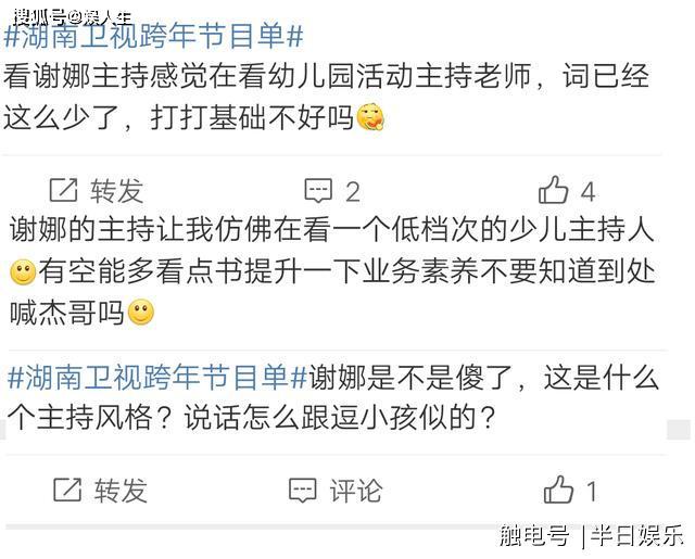 虽然各路明星大神人气很高,但太阳女神谢娜的人气也丝毫不输任何人,何炅及其快乐家族盛赞她是“顶流”存在,当然,谢娜的人气火爆,更多的还是与她的主持有关系。不少网友批评她把湖南卫视跨年晚会主持成了幼儿园大型晚会,让人仿佛在看一个低档次的少儿节目主持人,能没事的时候看看书提高一下业务素质吗?