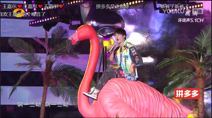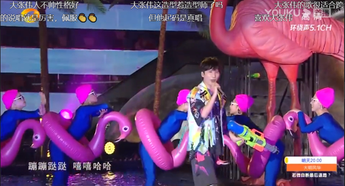 14.舞台够大,道具够多够复杂,我算是理解芒果台为什么那么多口播和广告,布景需要时间。骑着一个骚粉色火烈鸟的大张伟,边唱边撒花,吐字不清还以为他唱的是“手拿七彩花,散会”。
