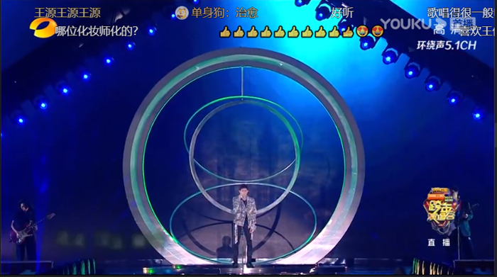王源画了个像哪吒的烟熏妆,唱了一首《源》,舞台上就摆了圆的道具装置。刚切第一个镜头的时候,不知道的还以为伴舞是要表演杂技,啊哈哈哈哈。
