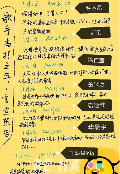 2020年跨年演唱会刚刚结束,芒果台就迫不及待的宣布新一期《歌手》将会在1月31日与观众正式见面了,并且发布了7位首发阵容,分别是:毛不易、周深、徐佳莹、萧敬腾、袁娅维、华晨宇以及日本歌手Misia。