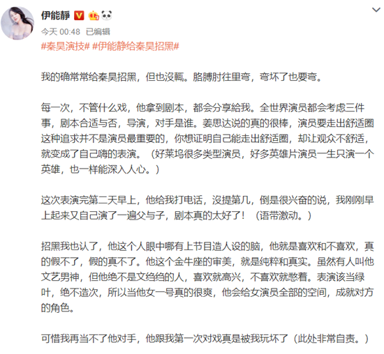 可能是被人恭维成才女习惯的,伊能静网上的动态和别的明星只言片语不同的是,一发感慨就是长篇大论。于是3号凌晨,伊能静对给秦昊招黑又是一通的长篇大论。开篇伊能静就带了两个话题:“秦昊演技”“伊能静给秦昊招黑”:我的确常常给秦昊招黑,但也沒輒。胳膊肘往里弯,弯坏了也要弯。最后伊能静说:反正近来我是黑成一只黑天鹅了,而且随时准备被火烧成鹅肉,那就不客气我写吧,他演的怎么样,也许你们说了算,但我是粉头,我还是想吹吹彩虹,他是用眼神不是用五官表演的演员,这是我粉他一辈子,初心不改的原因。好了,不用黑我,我关燈了。