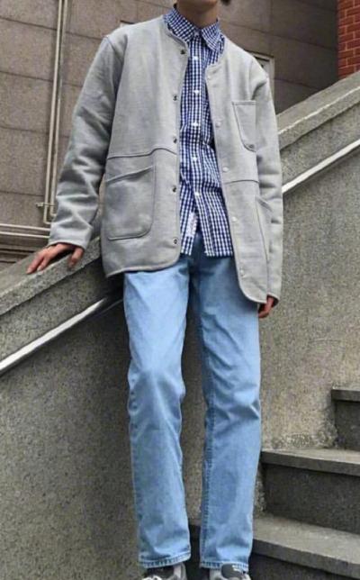 短外套是一种很好的外套形式,因为它可以在视觉效果上发挥很大的作用。它的腰线设计比较高,能够拉长腿型,分分钟穿出大长腿的感觉。四字弟弟这件外套的颜色是饱和度很高的红色与部分深蓝撞色拼接,但是这个红色的亮度是比较低的,因此它的可搭配性也还可以。里面搭配了红黑格子的衬衫以及白色的T恤,红黑格子就与外套相呼应了,白色T恤在这里也起到了一个过渡的作用。由于上身的颜色比较多,所以下身就选择了一件很简洁的黑色长裤。