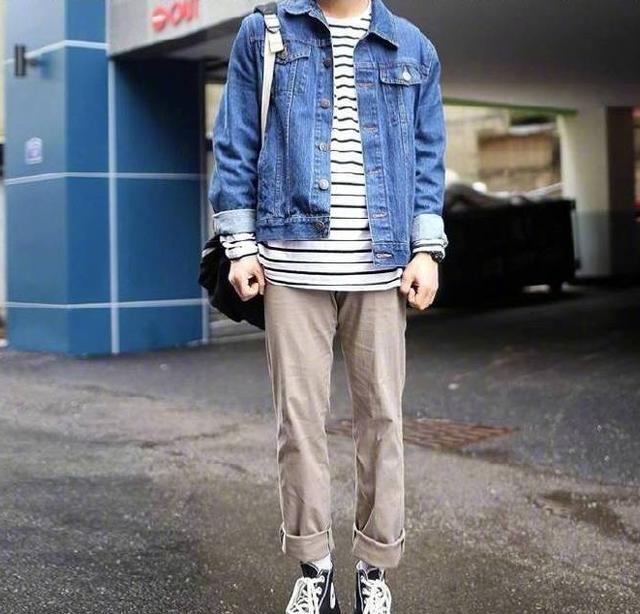 这件牛仔外套的款式非常经典,它的颜色也是非常常见的牛仔蓝色,在外套的里面,搭配了一件白底黑条纹的长袖T恤。