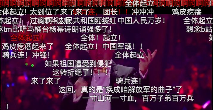 GAI演唱《哪吒》的时候,网友们狂刷弹幕:此生无悔入华夏。张光北亮相时,网友们弹幕刷更是达到了新的高点,他演唱的《中国军魂》是抗日电视剧《亮剑》的主题曲。