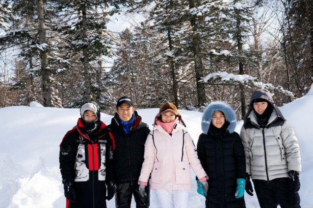 一家五口带着笑容站在雪地里留下温馨的合照,其乐融融,氛围非常融洽。