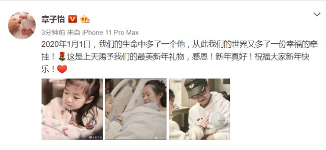 1月3日章子怡在社交平台上发文宣布了成功生下儿子的喜讯,配文写道:“2020年1月1日,我们的生命中多了一个他,从此我们的世界又多了一份幸福的牵挂!这是上天赐予我们的最美新年礼物,感恩!新年真好!祝福大家新年快乐!”言语中掩藏不住的激动。