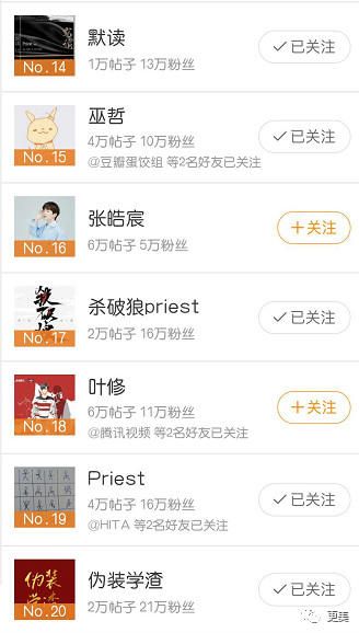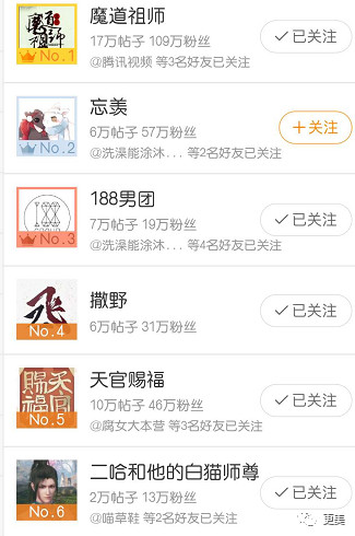 微博读书超话排行榜前几名基本都是耽美小说与耽美作者,像《魔道祖师》的墨香铜臭,《镇魂》的P大,还有《撒野》的巫哲都位列其中。