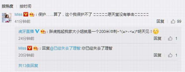 虎牙表示让兄弟萌把保护打在公屏上,药水哥放心大胆地飞吧!MISS也在评论区凑热闹,发言称“保护……算了,这个我保护不了,愿天堂没有拳击”!
