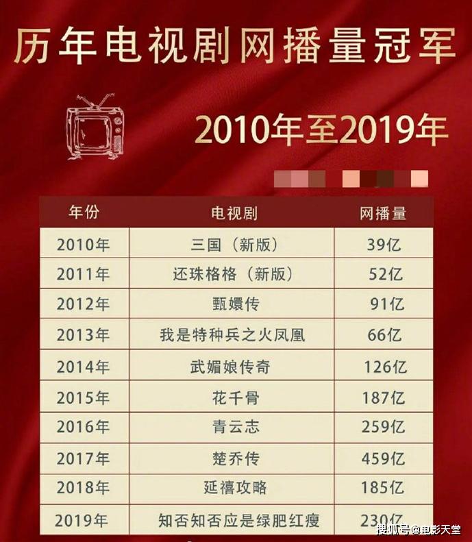最近,一份由专业数据网站统计产生的“历年电视剧网播量冠军”清单在网友之间流传,这份清单盘点了从2010年到2019年十年间每年电视剧的网络播出量冠军,从清单中可以看到,今年网播量最多的电视剧竟然是年初的《知否知否应是绿肥红瘦》,播放量达到了230亿。