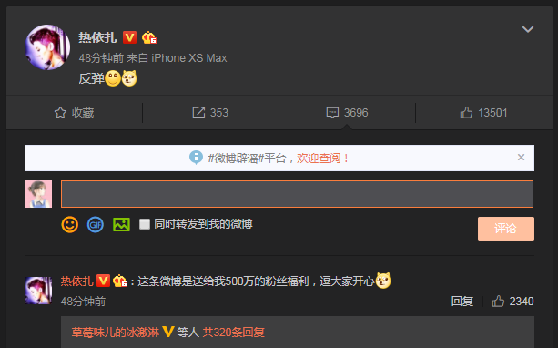 最后热依扎也终于在11月2日22点09分结束了所有回评,并回复网友一句“这条微博是送给我500万的粉丝福利,逗大家开心。”如果只是逗网友开心,而且还间接让粉丝人数飙升至500万,那么还是可喜可贺的,但这样真的很好吗?