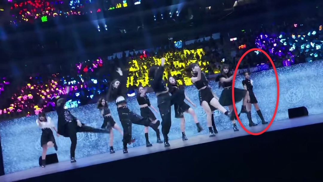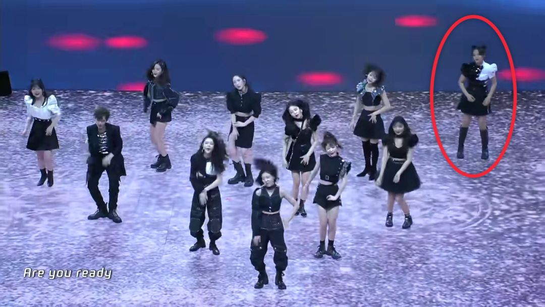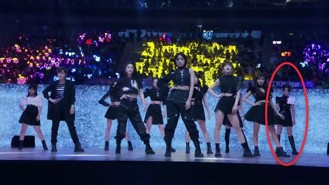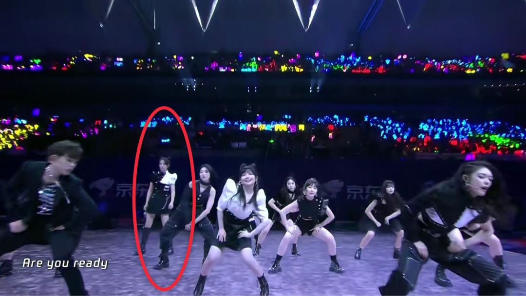 这一张截图能看得更清楚一些,其他团员在跳舞的时候,杨超越就站在原地瞟着其他女团员。