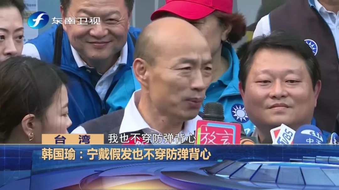 和蔡英文穿防弹衣扫街、特勤人员紧盯行程不同,韩国瑜拒绝穿上防弹背心,表示对台湾的治安有信心,也认为台湾的民主发展已经完全成熟,“我宁愿戴假发也不会穿防弹背心”。