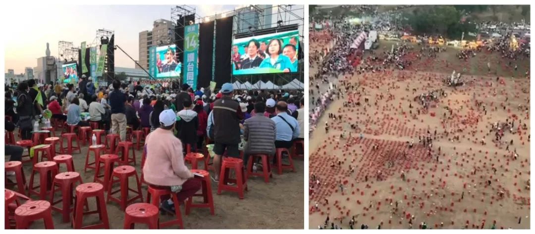 “洪流”战力之强,让绿营看到傻眼,因为蔡英文的场子正好相反。蔡英文还在台上大讲“顾主权”,台下吃完便当的民众已经脚底抹油,纷纷坐上游览车回家。靠近造势舞台的前中段有一片空荡荡的座位区没有人坐,场面相当尴尬。随后,有网友贴出造势活动的空拍图,让“韩粉”直呼“我放心了”。