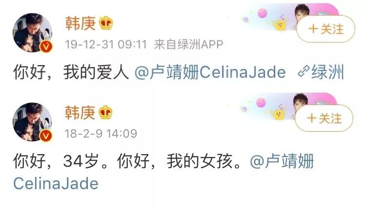 韩庚、卢靖姗在绿洲晒出结婚照官宣结婚喜讯,并配文:“你好,我的爱人”。正式呼应公布恋情时的“你好,我的男孩”“你好,我的女孩”。