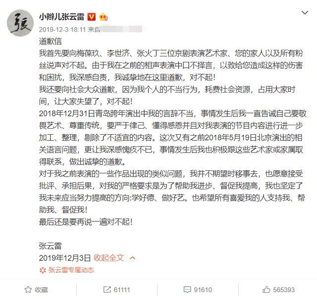 一个月前,张云雷公开道歉:我首先要向梅葆玖、李世济、张火丁三位京剧表演艺术家、您的家人以及所有粉丝说声对不起。从视频中来看,张云雷的相声中确实提到了一些不适宜的话。被权威媒体点名批评后,张云雷并没有掩饰和推责,至少态度是端正的。至于他有没有真心悔改,要看以后他的行动了。