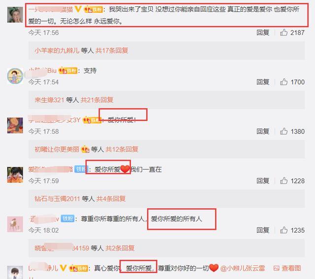 而张云雷的粉丝的态度,则是坚定支持自己的偶像。一个粉丝看了张云雷的声明,说:我哭出来了,宝贝。没想过你能亲自回应这些。真正的爱是爱你,也爱你所爱的一切。无论怎么样,永远爱你。还有很多粉丝纷纷留言:爱你所爱,我们一直在,爱你所爱的所有人。真心爱你。
