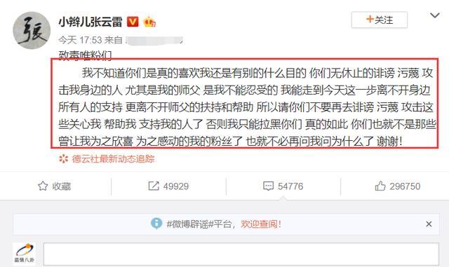 1月7日晚上,张云雷发了一个微博《致毒唯粉们》,怒问毒唯粉是真的喜欢我还是有别的什么目的。近日,有一些网友不停地诽谤、攻击张云雷身边的人,尤其是郭德纲。张云雷第一时间公开声讨毒唯粉,实际上是力挺郭德纲,更是公开表态绝不会离开德云社,离开郭德纲。
