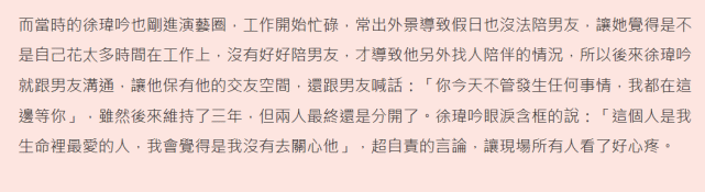 于其他女生而言,男友对自己不忠,她们肯定想方设法大吵大闹,让对方心生歉意。但徐玮吟却没有,她开始反省自己对这份感情的付出。因为演艺圈工作繁忙,她要常出外景,导致并没有时间陪伴男友,她认为,男友出轨的行为是人之常情。为此她也积极与对方沟通,表示并不妨碍男友的交友空间:“你今天不管发生任何事情,我都在这边等你。”但这段感情只维持了3年,毕竟破碎的感情如镜子一般,修复后还会有裂痕。对此,徐玮吟认为这份爱情被断送,原因全在自己身上:“这个人是我生命里最爱的人,我会觉得是我没有好好去关心他。”她声泪俱下地讲出这番自责的话实在令人心疼。
