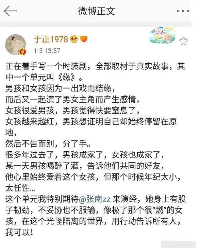 近日,于正发布了一则留言,虽然他很快秒删,但还是被网友截图: