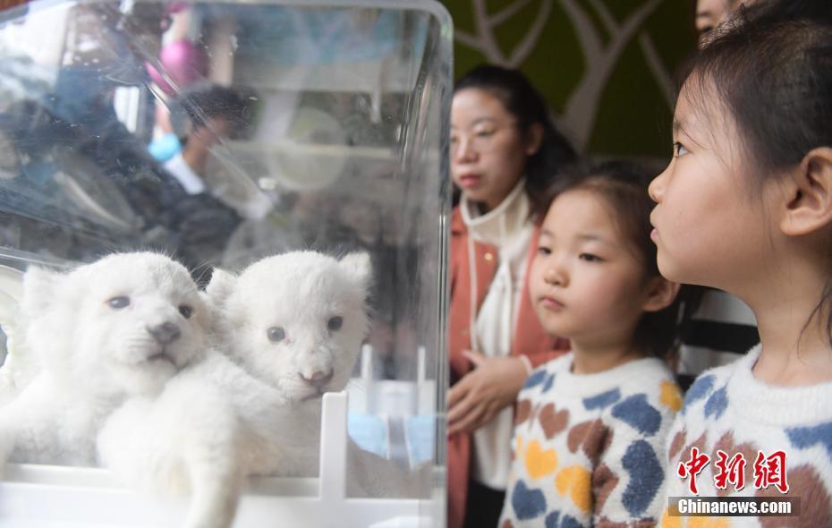 济南“龙凤胎”白狮满月亮相 萌态十足