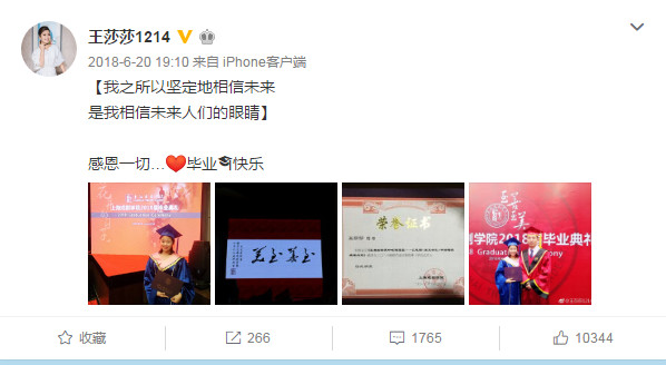 入学上戏之后,王莎莎并没有像很多童星那样到处接戏,而是把精力放在了用功读书上,见到她晒出的各种证书和硕士毕业照,小扒才知道原来她也是学霸一枚。
