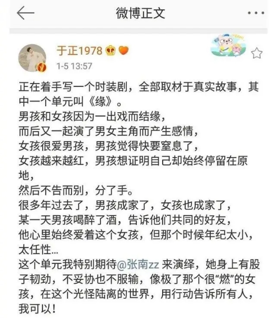 前几天,于正为了捧这位新人还蹭了一波赵丽颖和陈晓的热度,称自己在写一个时装剧,取材于真实的故事,而于正的这个故事明眼人一看就知道写的是谁?谁知道于正居然敢做不敢认。