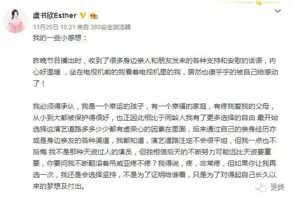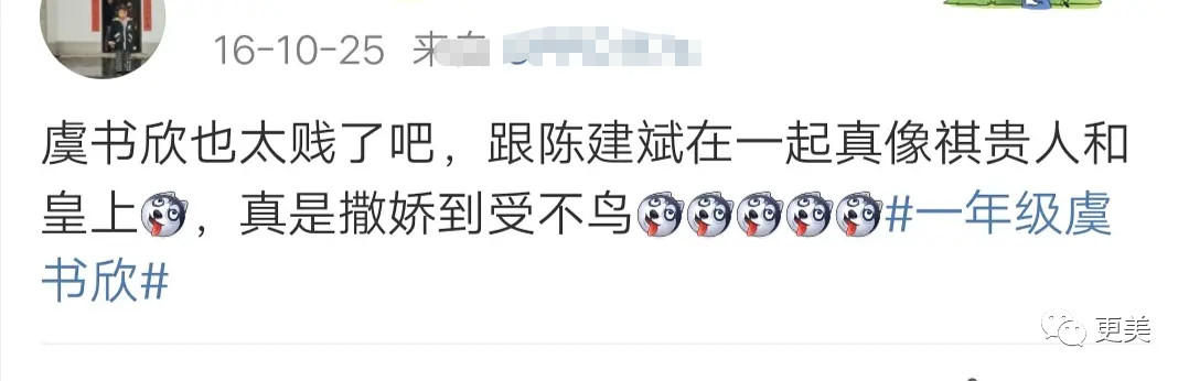 当时的导师是陈建斌和娄艺潇,一群新生合作表演完一段戏后由导师一一点评,开头就表扬了虞书欣,说她表演的不错,但还有不足之处。