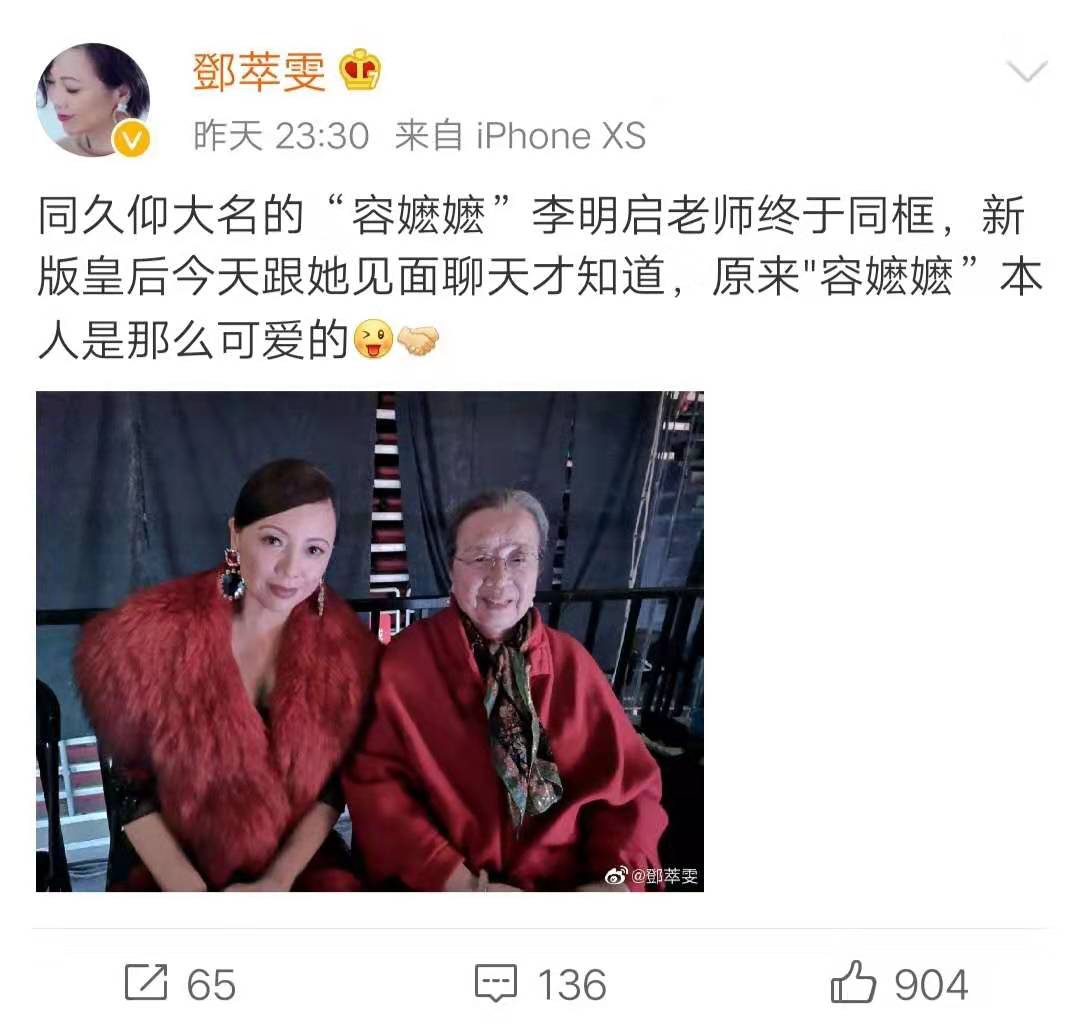 1月8日晚上11左右,TVB资深演员邓萃雯在社交平台发出了一张和容嬷嬷李明启的合照,邓萃雯还配文:“同久仰大名的容嬷嬷李明启老师终于同框,新版皇后今天跟她聊天见面后才知道,原来她本人那么可爱!”邓萃雯激动难掩。