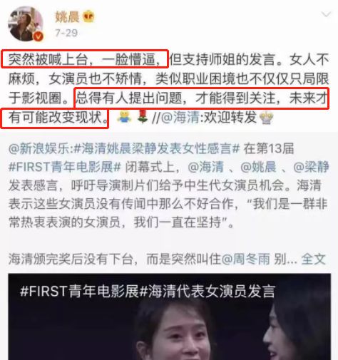 可又恰恰是她们两个最哭穷卖惨,姚晨在演讲现场没什么表示,估计是自己突然被cue没什么准备。只是在之后的微博转发中,姚晨的评论表达了两个意思