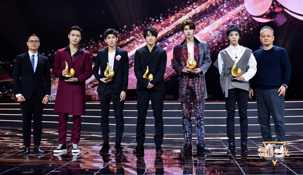 另外一个值得玩味的细节是,年度音乐人奖项,颁给了蔡徐坤、华晨宇、张艺兴、薛之谦和王源,从现场照片来看,几个人都认真的捧着奖杯拍照,唯有薛之谦,把双手交叉放在身前,奖杯则夹在双手和身体之间,只露出一点,脸上也是一副很无聊的表情。