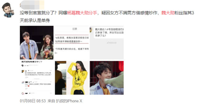 在杨幂和魏大勋的沉默声中,讨论的声音真的越来越少。令人没有想到的是,在众网友的期待中,还没等到两人之间有个所以然来,两人分手的消息却传了出来。1月8日,就有网友曝出杨幂和魏大勋还没等到官宣就分了,疑因杨幂一方不满意魏大勋团队借两人的恋情炒作而断了交往。而魏大勋在1月4日出席某活动时,在活动现场也已经澄清自己是单身状态,由此看来,两人分手的消息极有可能是真的。