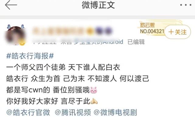 但是,双男主的剧从来都不缺少争番位的事情,之前的《镇魂》和《陈情令》都是如此,即便是两个人都凭借作品火了,粉丝也还是一定要争一个一番二番。这不,《皓衣行》这部剧都还没有官宣演员阵容,罗云熙的粉丝就已经开始提前打预防针了,表示罗云熙一定要是一番,不能够模糊番位,不然粉丝是不会放过官方的。