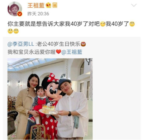 1月9日,李亚男在微博上晒出全家福为王祖蓝庆生,照片中一家人对着镜头甜笑,李亚男配文称:“老公40岁生日快乐,我和宝贝永远爱你喔!”