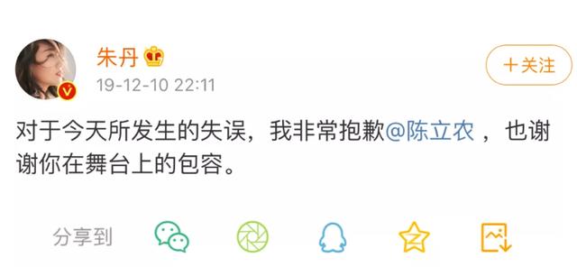 叫错陈立农之后,朱丹再一次在微博上道歉,陈立龙也暖心回复了,“没事的朱丹姐,我是新人,继续努力”。