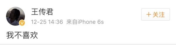 2016年,王家卫电影《摆渡人》上映,虽然后续口碑奇烂无比,但冲着王家卫的面子,几乎整个娱乐圈的大咖明星纷纷抱团声援“我喜欢”,而在这时,唯独王传君,在微博上写下了“我不喜欢”这四个字,与圈内众多抱团的明星,形成了独自的清流。