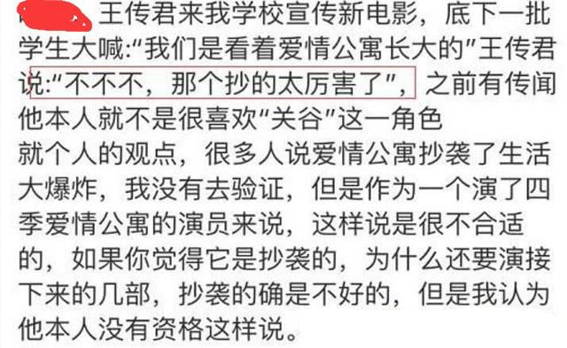 前脚拒绝参演成名作,后脚吐槽是抄袭剧集,王传君的态度自然让大部分观众感到不满,不少网友也认为,王传君既然知道《爱情公寓》涉嫌抄袭,却偏偏连续主演了四季,等到自己吃了流量红利之后,马上就回踩,这种行为属实有点太low。