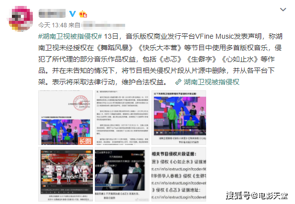 不过意气风发的芒果台最近也摊上事了。因为在节目中未经授权使用别人的音乐作品,某音乐公司今天发布了一则维权声明,正式对芒果台的侵权行为发起控诉,并表示会采取进一步法律手段维护合法权利。
