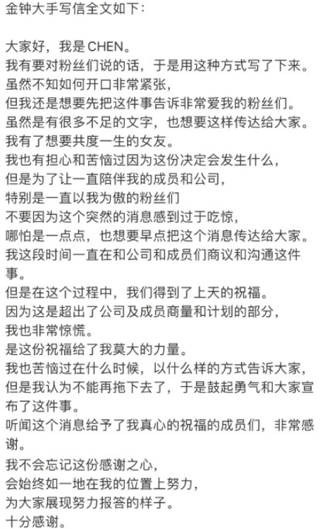 1月13日,EXO成员CHEN金钟大承认恋爱,发表手写信,疑似直接奔着结婚去的。他表示:“我遇见了想要度过一生的女朋友,和公司和成员商议的过程中,我们得到了上天给予的祝福。所以我认为不能再拖下去了,于是鼓起勇气和大家宣布了这件事。”