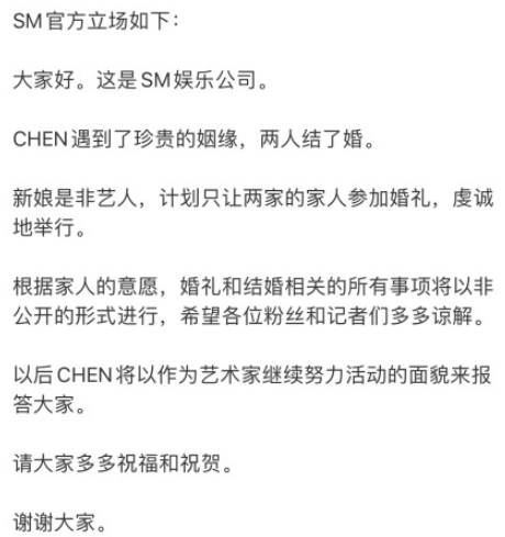 官方立场表示:“CHEN遇到了珍贵的姻缘,将要结婚。新娘是圈外人士,婚礼只有双方家人会参加,计划虔诚地举办根据家人的意愿,有关婚礼及结婚的所有事项都是非公开进行的,敬请各位粉丝和记者谅解。今后,CHEN将一如既往地以努力活动的面貌报答大家。”