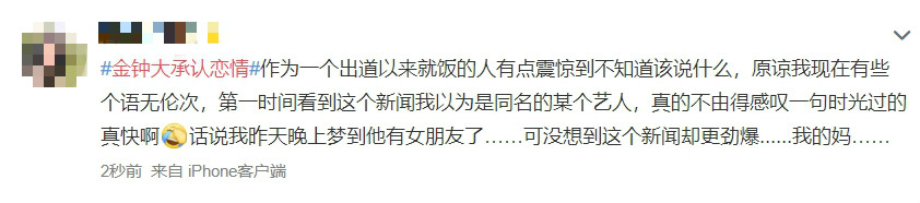 金钟大坦率承认恋情的方式让网友震惊,随后也有很多人表示祝贺。