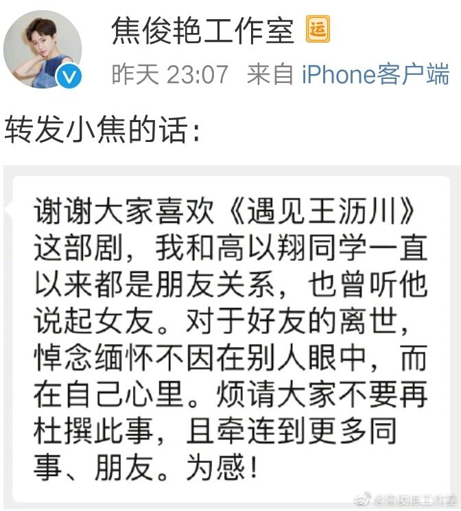 首先,焦俊艳因为和高以翔合作的《遇见王沥川》让大家入戏太深,以致于高以翔已经去世一个多月了,还有网友用cp粉的眼光去臆想和造谣两人的关系。