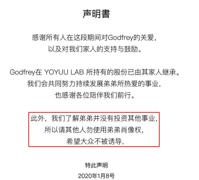 高以翔的哥哥还疑似为此发声澄清弟弟没有投资其他事业,希望其他人不要使用弟弟肖像权,也希望大家不要被诱导。