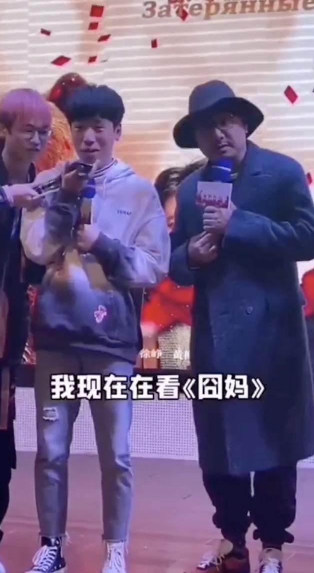 其中一名男性观众站在台上直播和母亲打电话,男粉丝对妈妈说道,我现在在看电影《囧妈》,然后这部电影的导演是徐峥,他现在就在我旁边。
