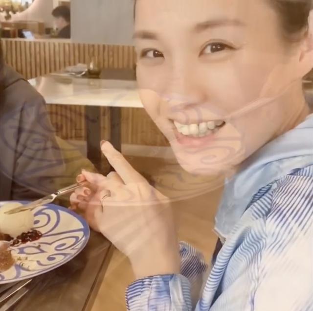 王婉霏身穿蓝白条上衣,素颜出镜,面前正放着一盘甜点,拿着刀子正准备品尝美食,看到镜头在拍她之后露出开心的笑容。