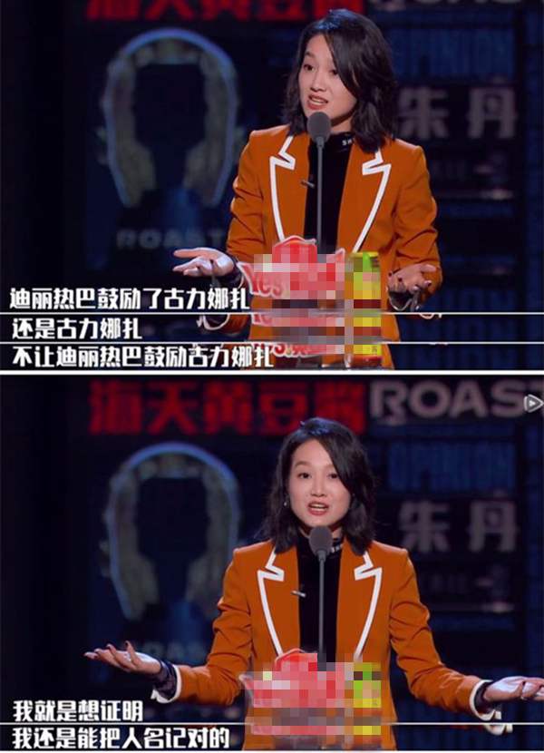到朱丹上场的时候,对着镜头道歉完她又用迪丽热巴和古力娜扎的名字编了一段绕口令,以证明自己可以把人名记对。
