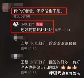 更有网友形容她有一个好老爸,不然啥也不是!但球球的反击是以有这样子的老爸为荣,开心的她似乎一点也不在意别人怎么说!的确是这样子,这也证明了她已经找到了属于自己的新路线,不再疑惑别人的说法。
