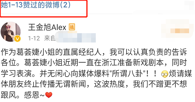 经纪人出面辟谣,可见之前的爆料都是传闻了。葛荟婕虽未亲自回应此事,但她在1月13日时,点赞了经纪人辟谣传闻的这条动态,她的用意不言而喻,力证传闻为假,表明自己对章子怡生二胎之事无感。