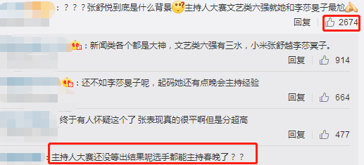 从网友的评论中,有人称“主持大赛文艺类六强就她和李莎旻子最尬,表现平平但分超高”,有人发出疑问“主持人大赛还没出结果就剧透了”,甚至有人称时隔8年的《主持人大赛》是为张舒越举办的.....