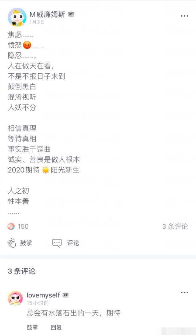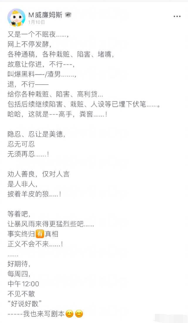对于网络舆论的一边倒,渣男、吃软饭、卷走1000万等词也已经成了张恒的代名词。从疑似张恒账号叫骂的文字来看,对于两人分手后郑爽和舆论的一点一滴,他都是一清二楚的。在连发好几条消息表达完自己的愤怒后,疑似张恒账号更是直言“忍无可忍无需再忍,正义不会不来!”似乎为了印证自己鱼死网破的决心,疑似张恒账号还直接预告“周四中午十二点不见不散”。从之前营销号曝出的消息来看,疑似张恒账号的这场预告难道是为了放郑爽的黑料?