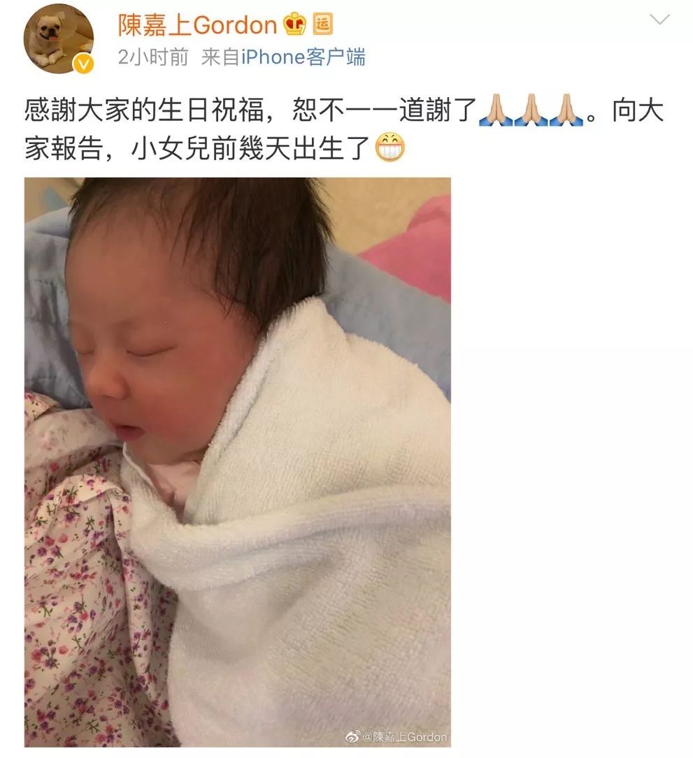 01月16日,知名导演陈嘉上在微博上晒出新生的宝宝照片,跟大家官宣了小女儿出生的好消息,字里行间尽是喜悦。从照片来看,宝宝在闭目养神,小小年纪五官就长得十分优越,尤其是鼻子坚挺樱桃小嘴,长大后肯定也是小美女一枚!